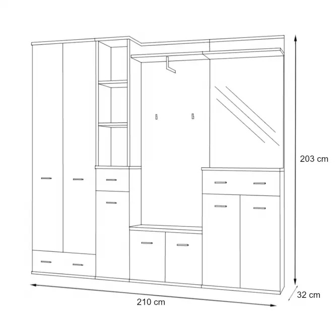 • Úzky stĺpik: tri otvorené police, zásuvka a skrinka s jednými dverami. Dve štandardné police za dverami (30/203/32)