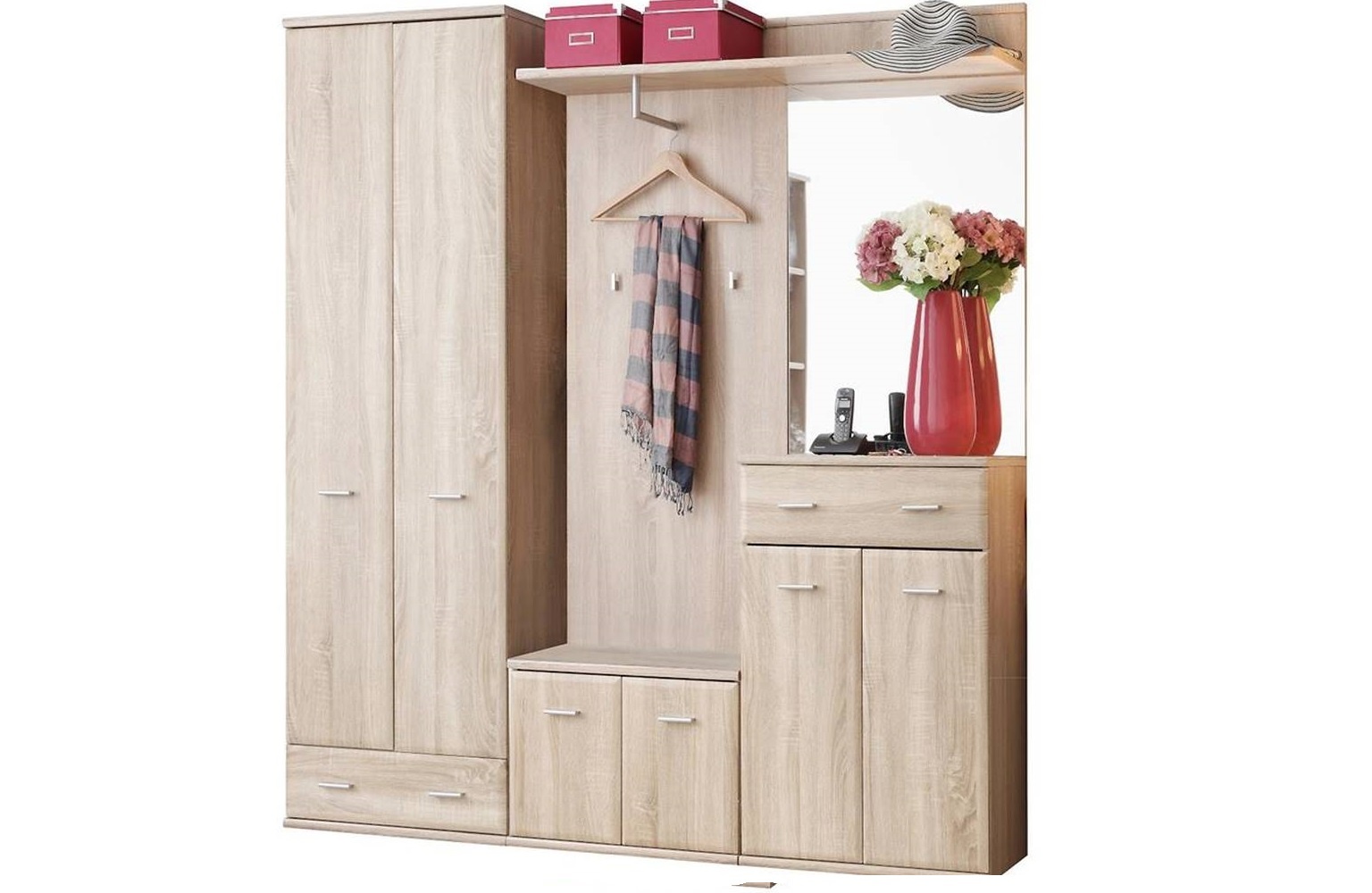 Kolekcia nábytku ARMARIO je dokonalým riešením pre predsieň, ktorá potrebuje funkčný, moderný a univerzálny nábytok - ladiaci s akýmkoľvek štýlom. Vďaka perfektne navrhnutému nábytku, získa miestnosť nadčasový charakter a zároveň je praktický a vkusný. Do skriniek ARMARIO môžeme umiestniť zavesené oblečenie, obuv a potrebné drobnosti. Systém bol obohatený o vankúš, ktorý vám umožní zmeniť obyčajnú skrinku na topánky na pohodlné a funkčné sedadlo, pod ktoré môžeme uložiť topánky. Toto riešenie vám umožní udržiavať poriadok v miestnosti, ktorá víta našich hostí. Decentná kombinácia duba sonoma s malé detaily striebornej farby dodávajú nábytku triedu a dokonale zodpovedá prevládajúcim trendom. Aby nábytok v našich miestnostiach dobre fungoval dlhé roky, boli na jeho výrobu použité najkvalitnejšie materiály: korpus je vyrobený z laminovanej drevotriesky, predná strana - MDF. Ďalšou výhodou pevných látok je použitie úchytov, ktoré uľahčujú používanie nábytku. Urobte na svojich hostí dojem, keď vstupujú aj odchádzajú z vášho domova.
