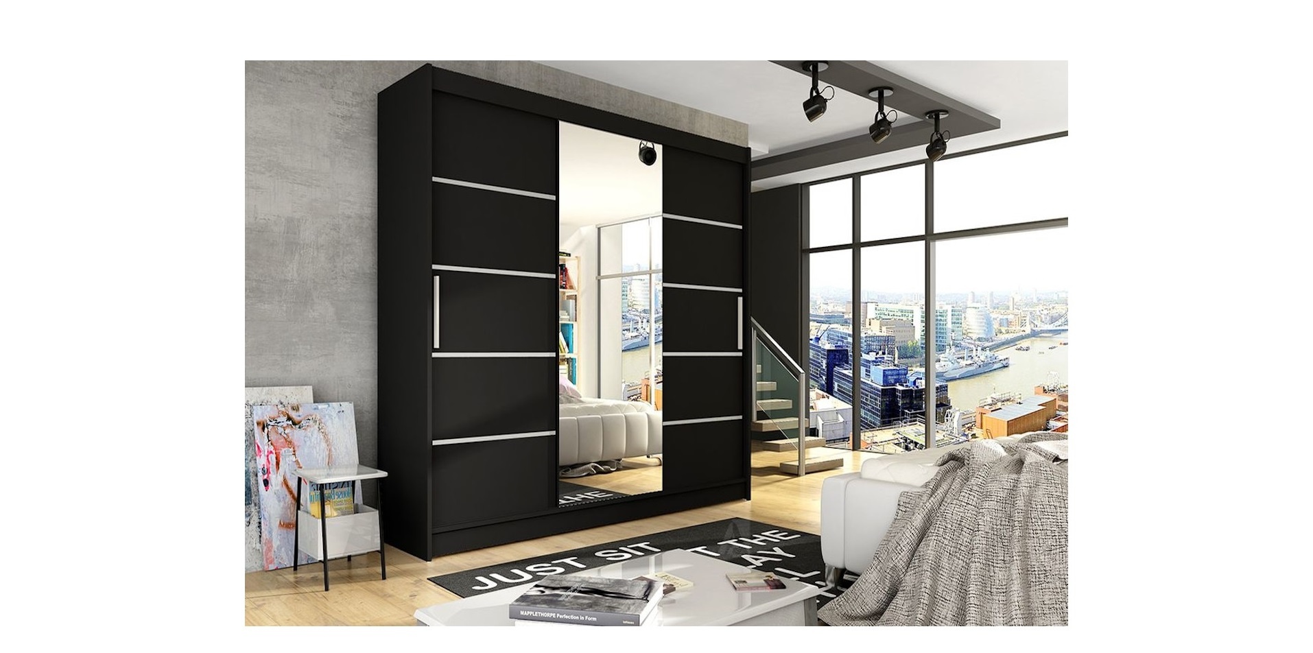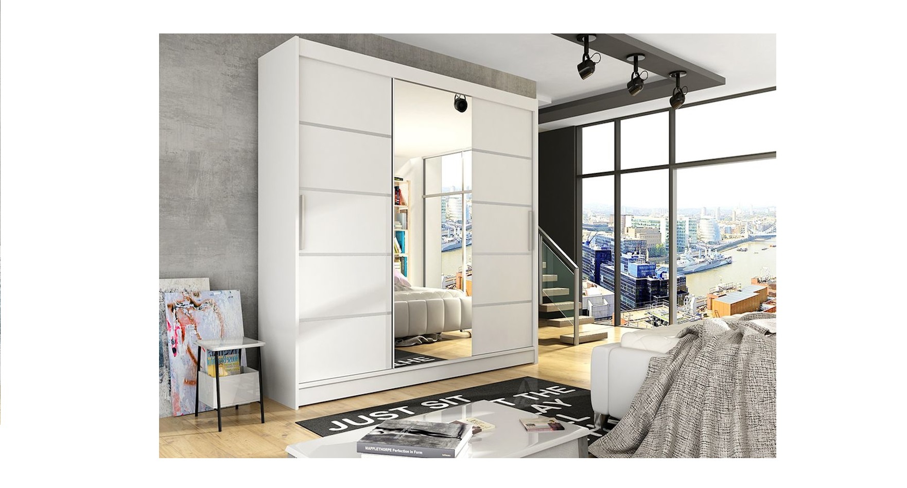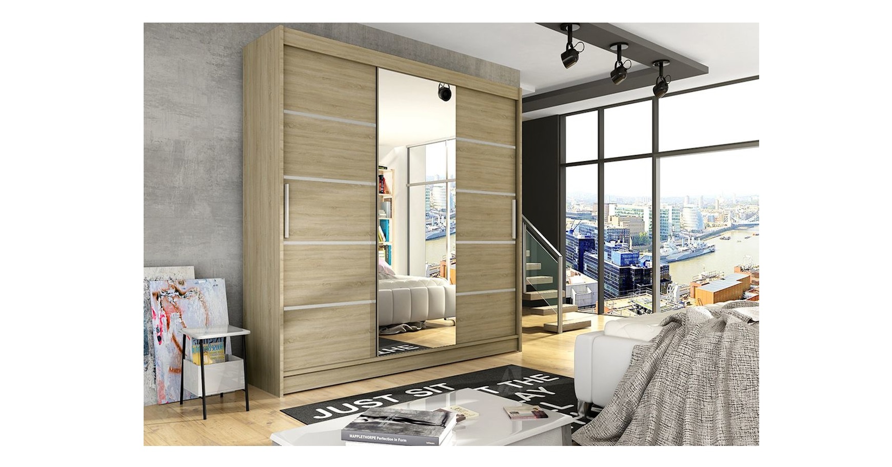Posuvná trojdverová šatníková skriňa ASTON VI so zrkadlom. Je vyrobená z lamina a vybavená hranami ABS. Za posuvnými dverami sa ukrýva veľké množstvo úložného priestoru. Poskytne vám priestranné police a šatníková tyč. Pre ľahšie otvorenie sú dvere vybavené dlhou rukoväťou. Iba si zvoľte farbu, nech skriňa zapadne do Vášho interiéru.