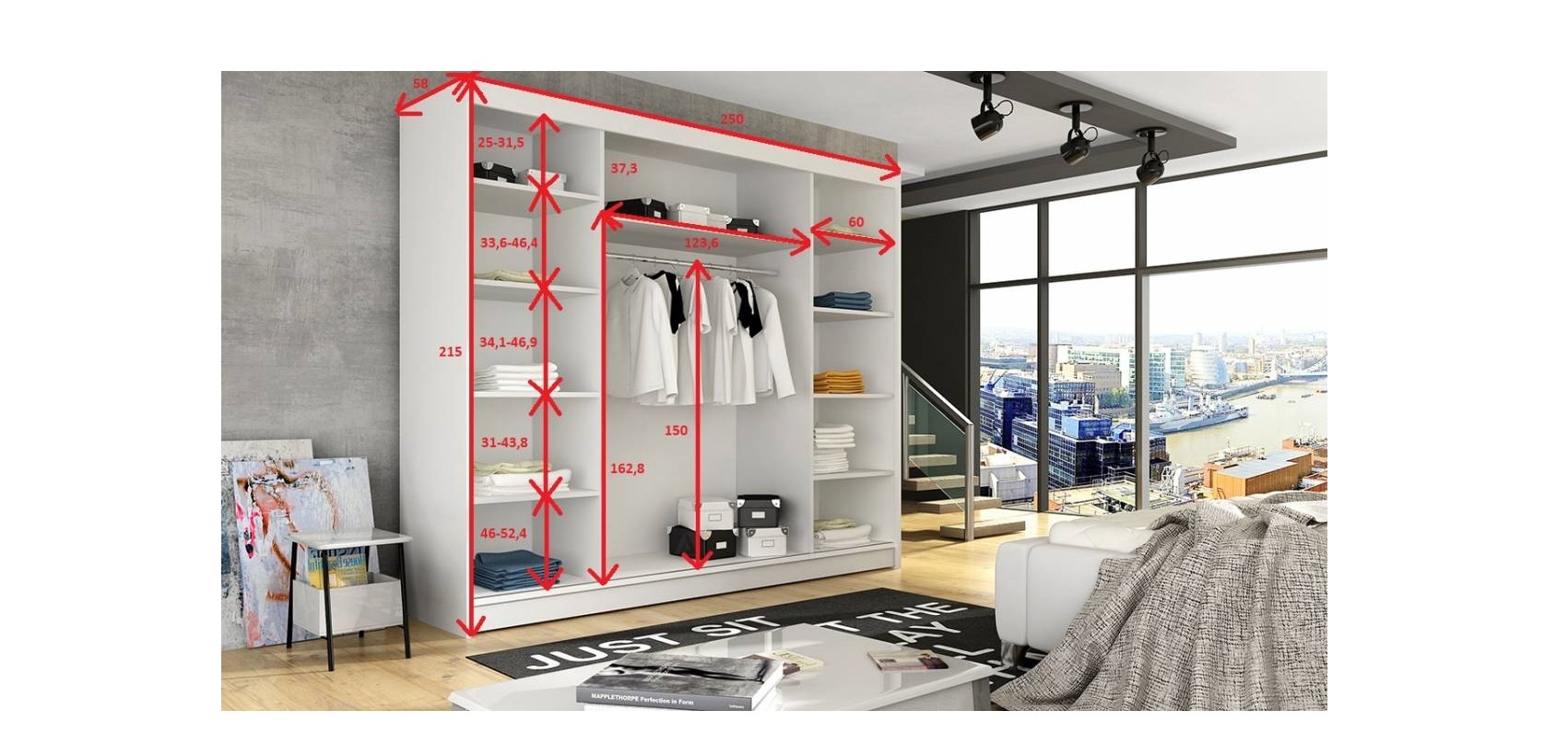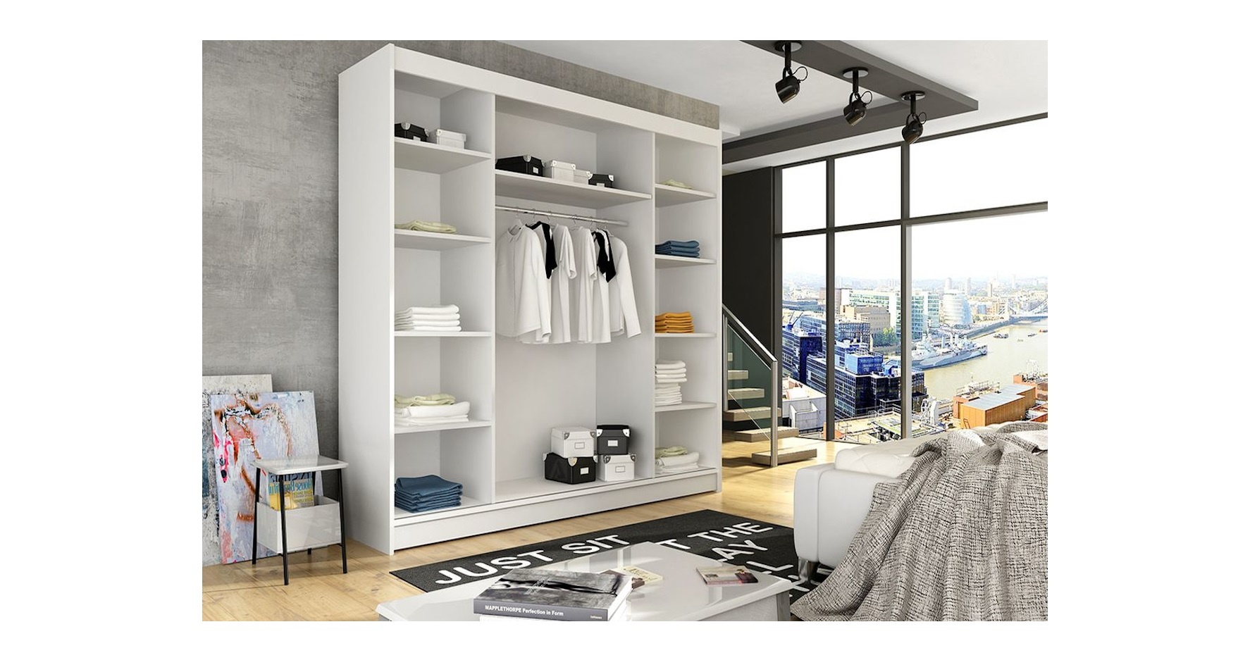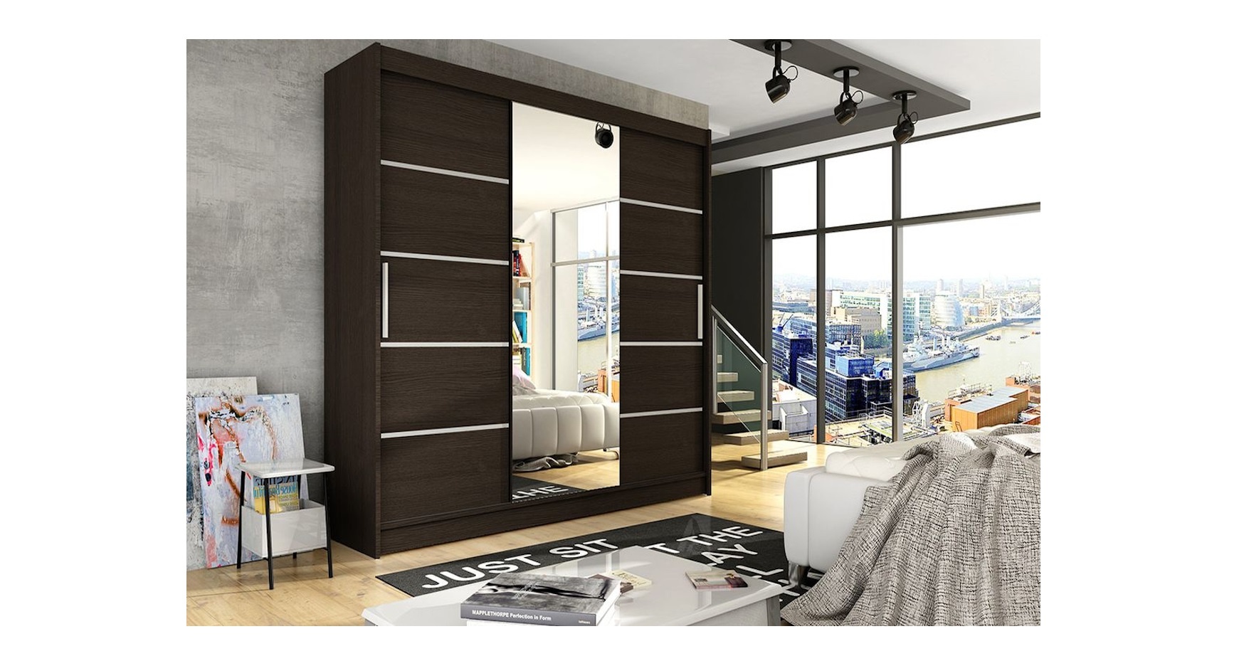 Posuvná trojdverová šatníková skriňa ASTON VI so zrkadlom. Je vyrobená z lamina a vybavená hranami ABS. Za posuvnými dverami sa ukrýva veľké množstvo úložného priestoru. Poskytne vám priestranné police a šatníková tyč. Pre ľahšie otvorenie sú dvere vybavené dlhou rukoväťou. Iba si zvoľte farbu, nech skriňa zapadne do Vášho interiéru.